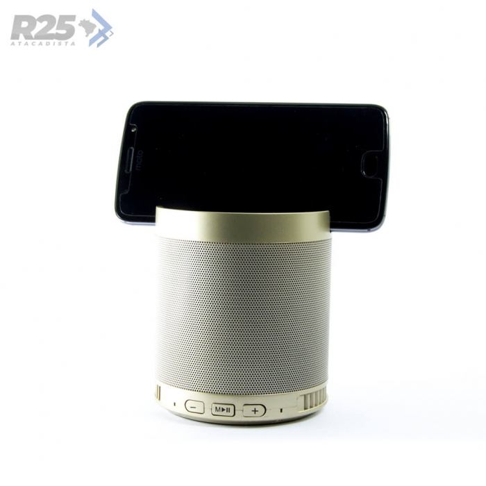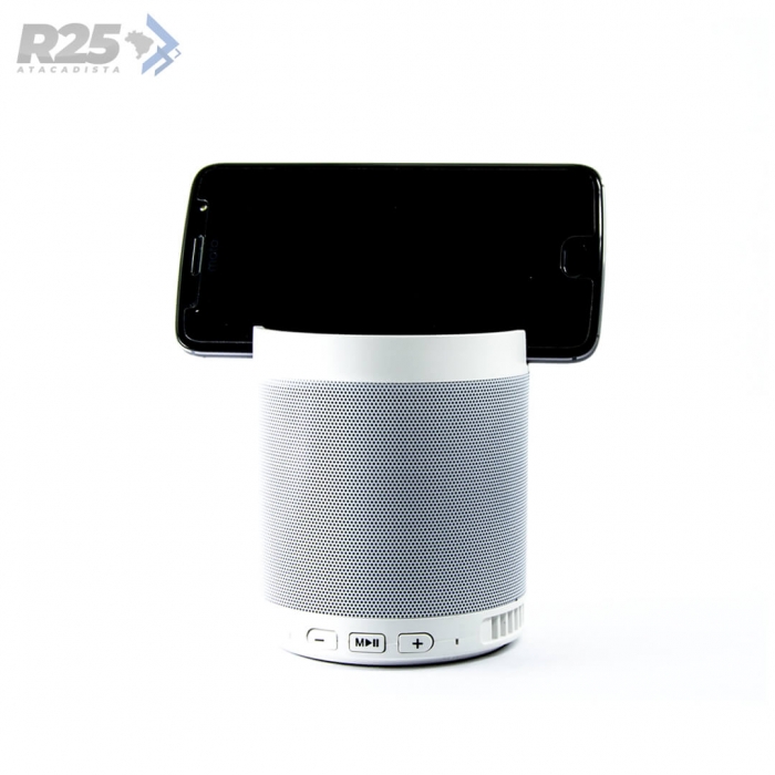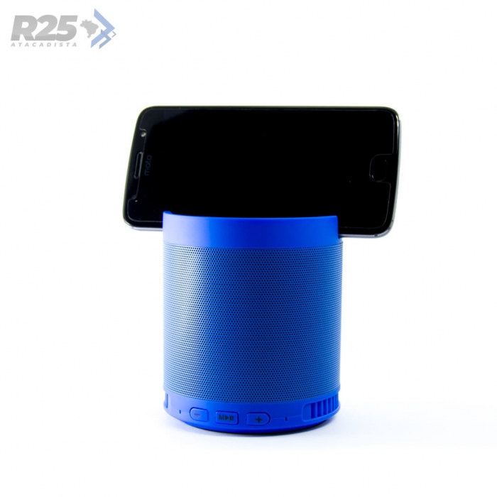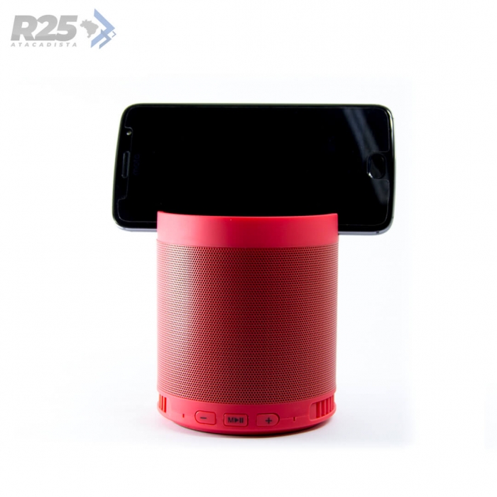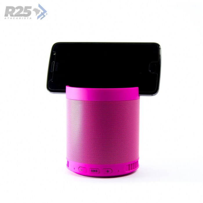 Disponível em diversas cores, seu design funciona como suporte para celular e é compacto sem deixar de lado a qualidade de som.