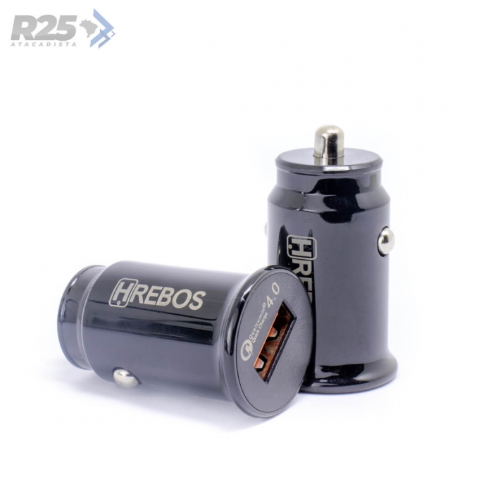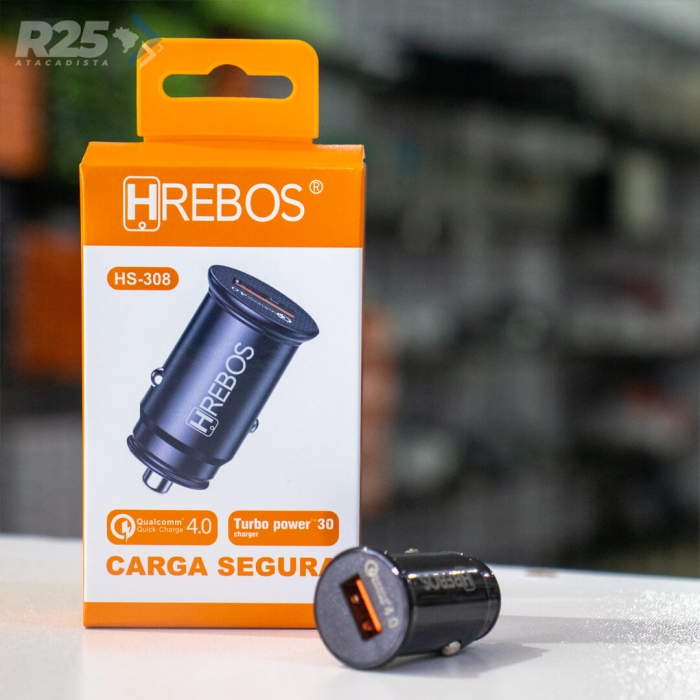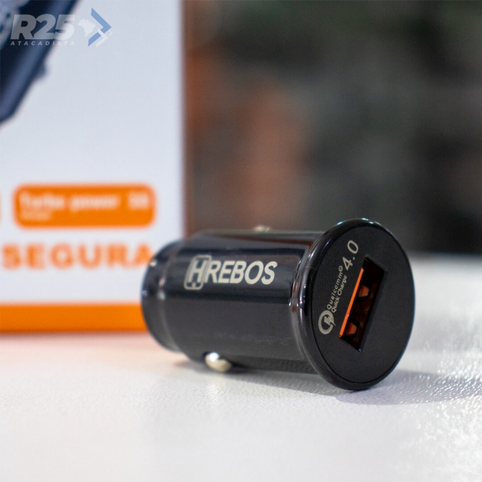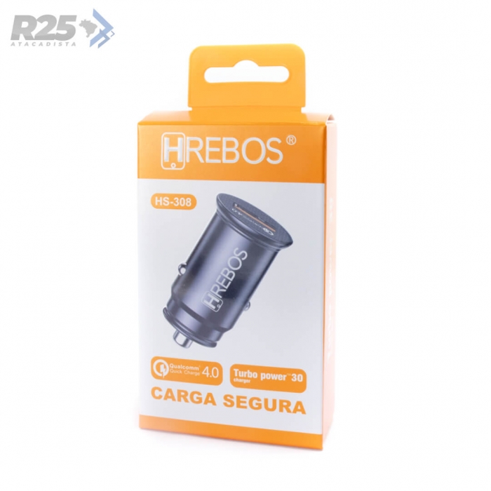 O Carregador Veicular HS-308 da HRebos está equipado com a tecnologia Qualcomm 4.0 que garante o carregamento Turbo com 30W de potência.