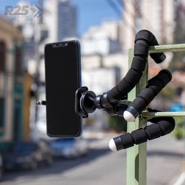 Não tem uma mesa ou uma superfície plana pra colocar ele? Não tem problema pois, como o suporte é flexível, é possível fixá-lo em diversos lugares!